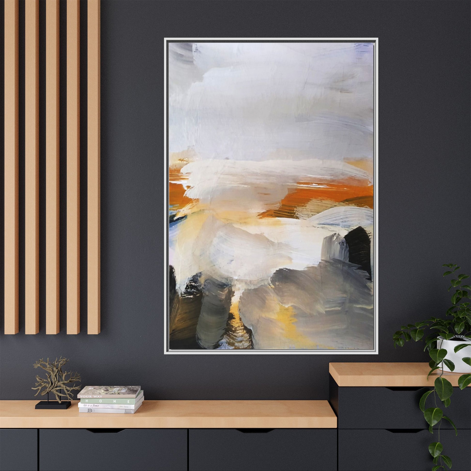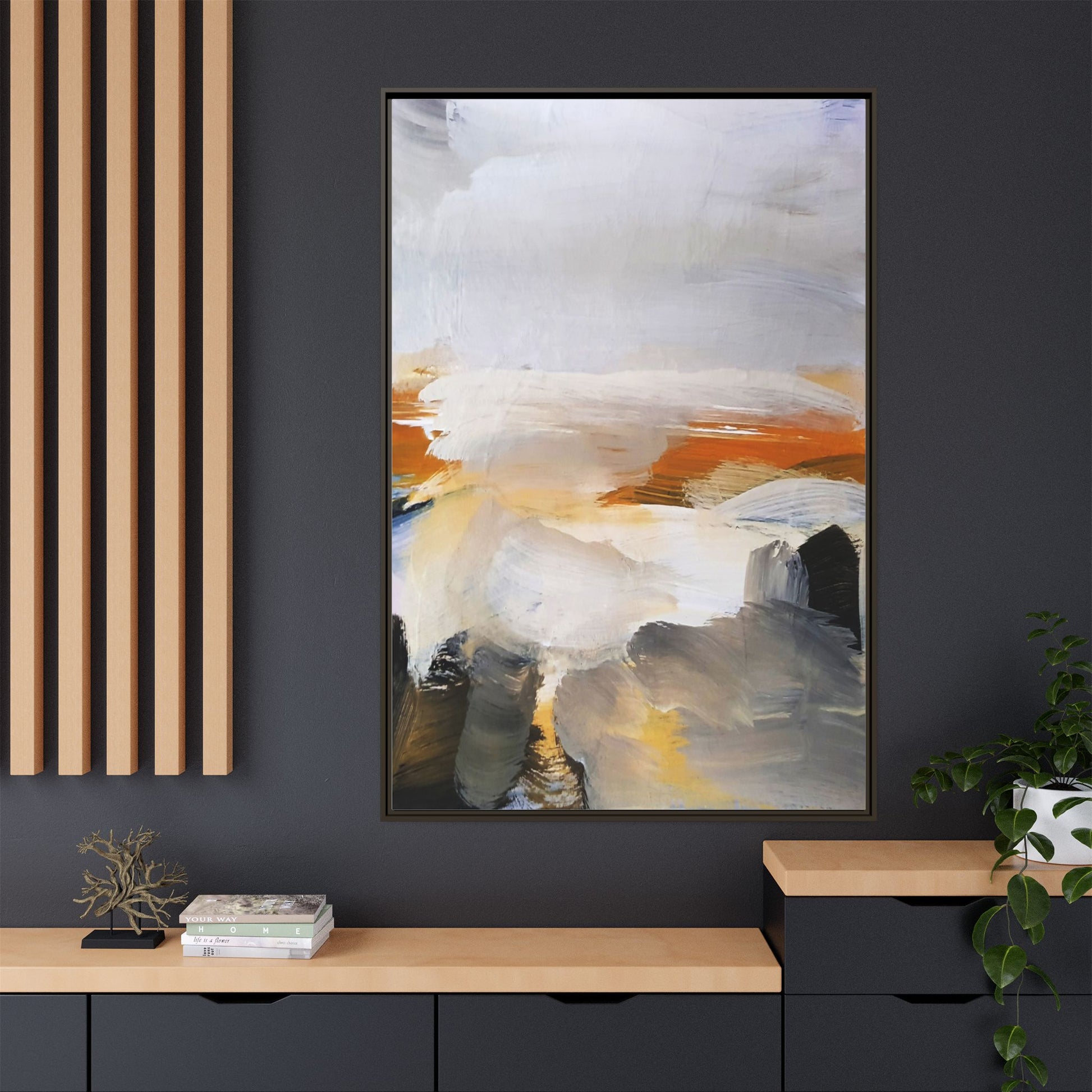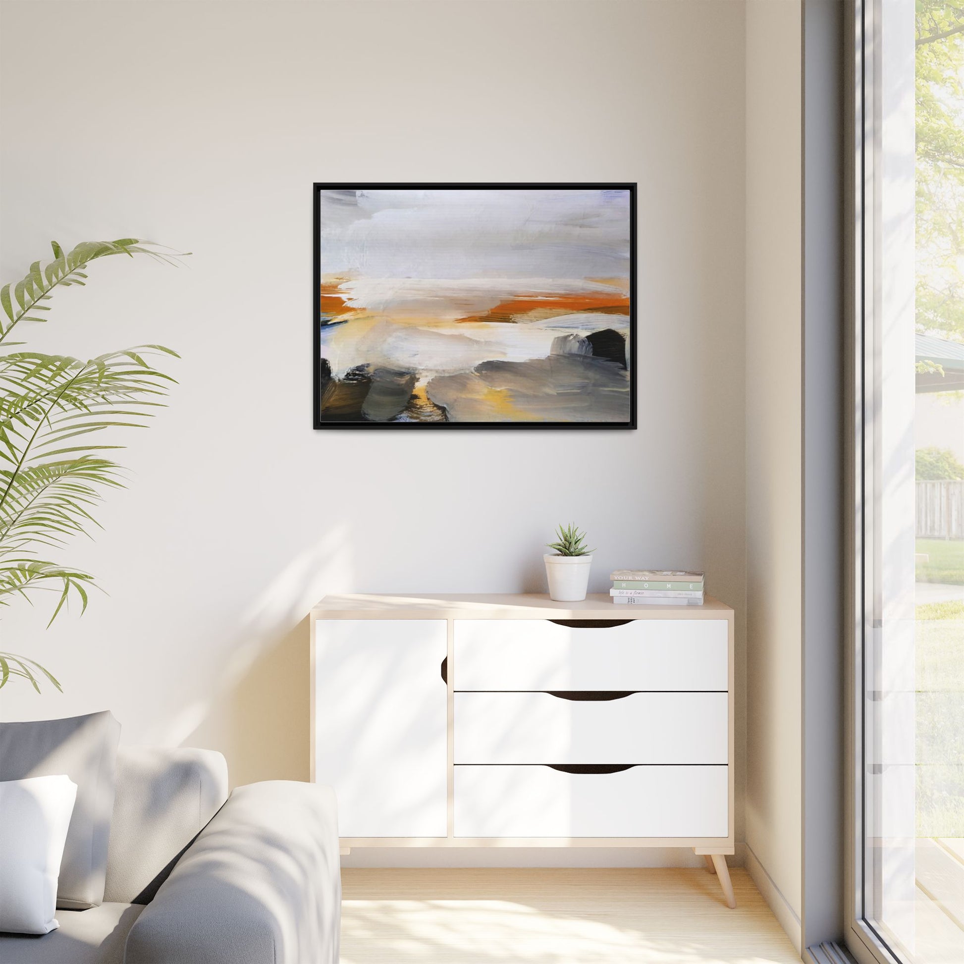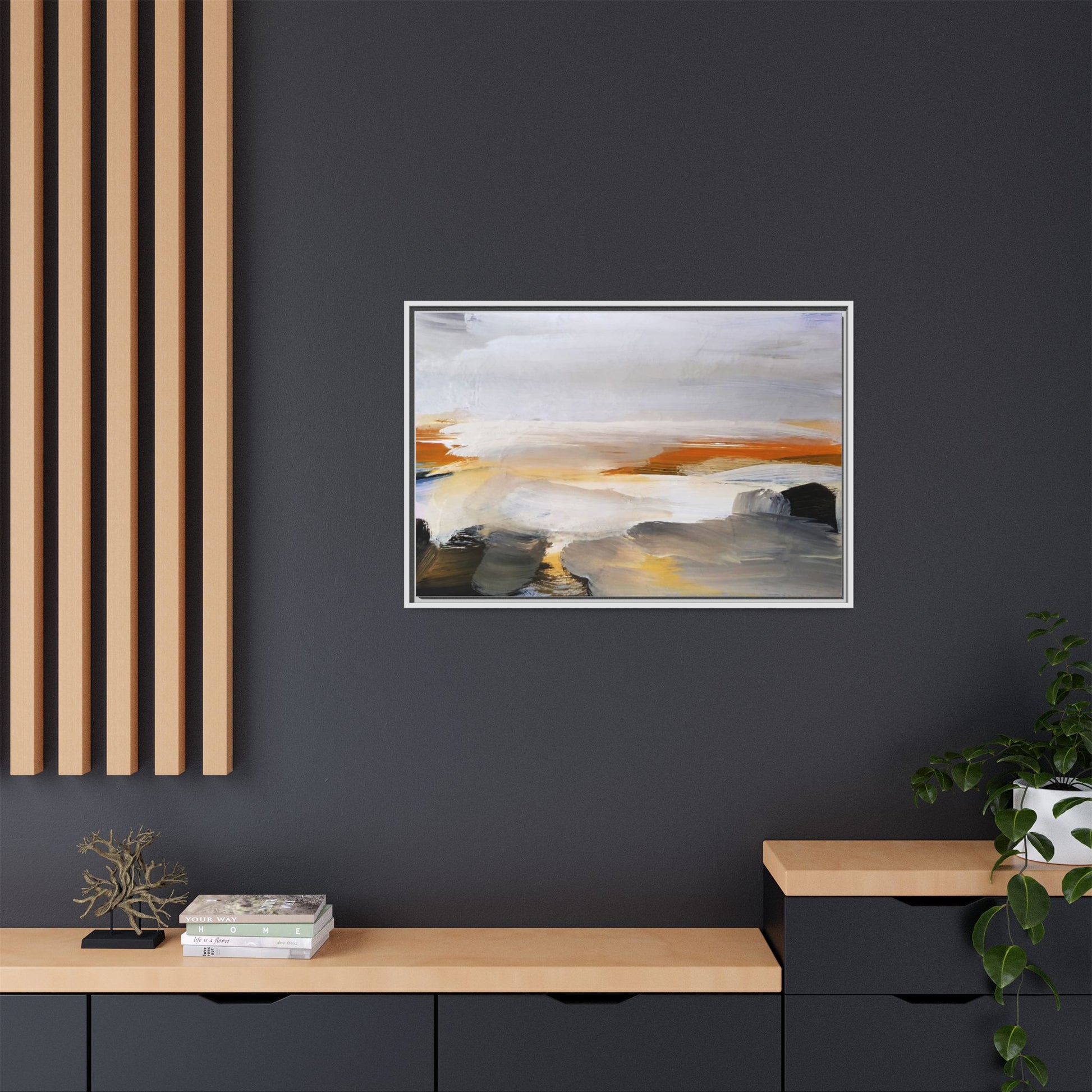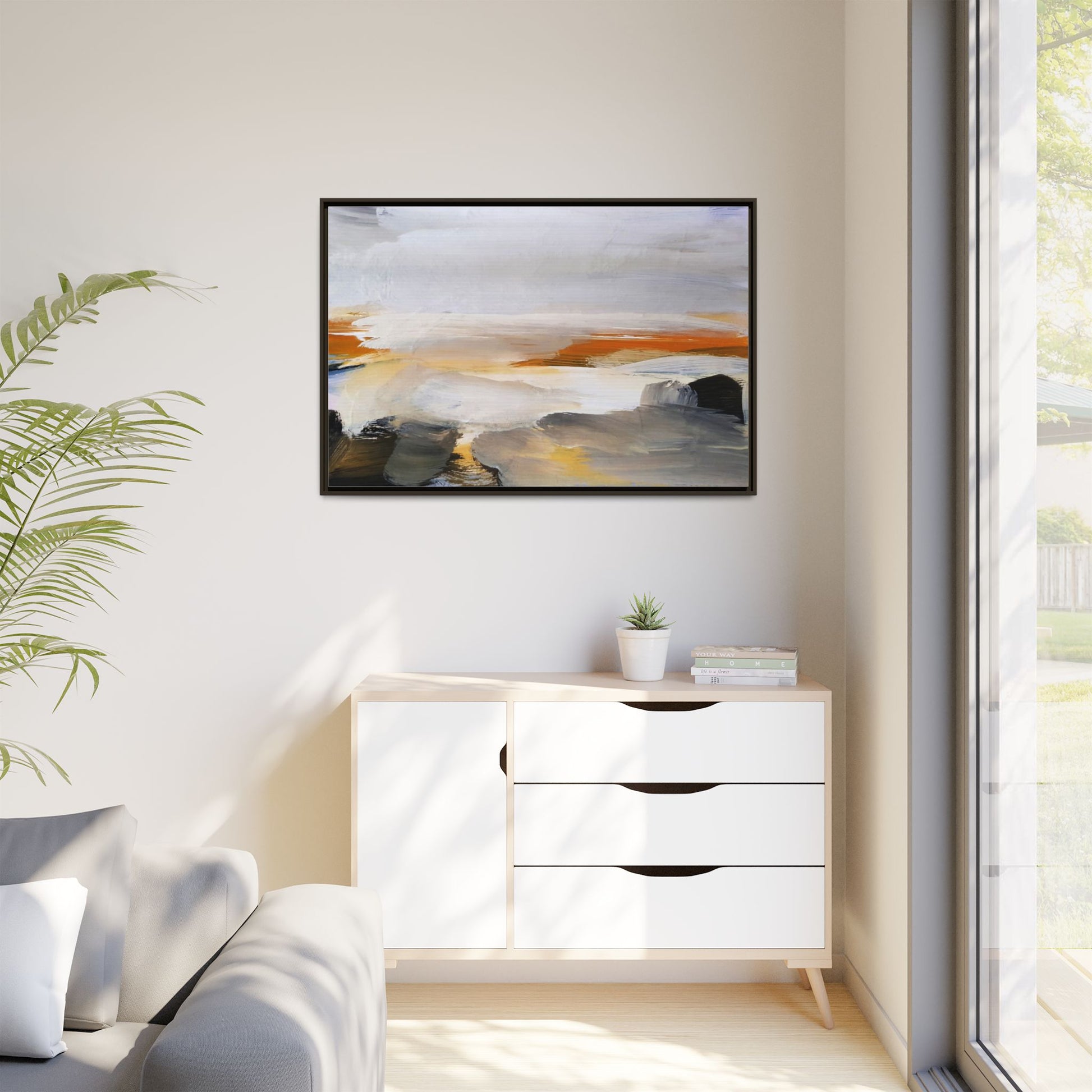 This captivating abstract landscape painting features a dynamic interplay of muted colors and sweeping brushstrokes, creating a sense of expansive depth and movement. The composition is dominated by soft whites, warm oranges, and cool grays that blend seamlessly across the canvas, evoking the atmospheric qualities of a distant horizon or ethereal landscape. Bold, textured brushwork gives the painting a sense of energy and motion, with horizontal streaks suggesting a windswept terrain or a distant seascape. The color palette transitions from bright, golden yellows on the edges to more subdued, silvery whites and grays in the central area, creating a luminous and contemplative mood. The painting's abstract style allows viewers to interpret the scene freely, inviting personal reflection on the interplay of light, space, and natural forms.