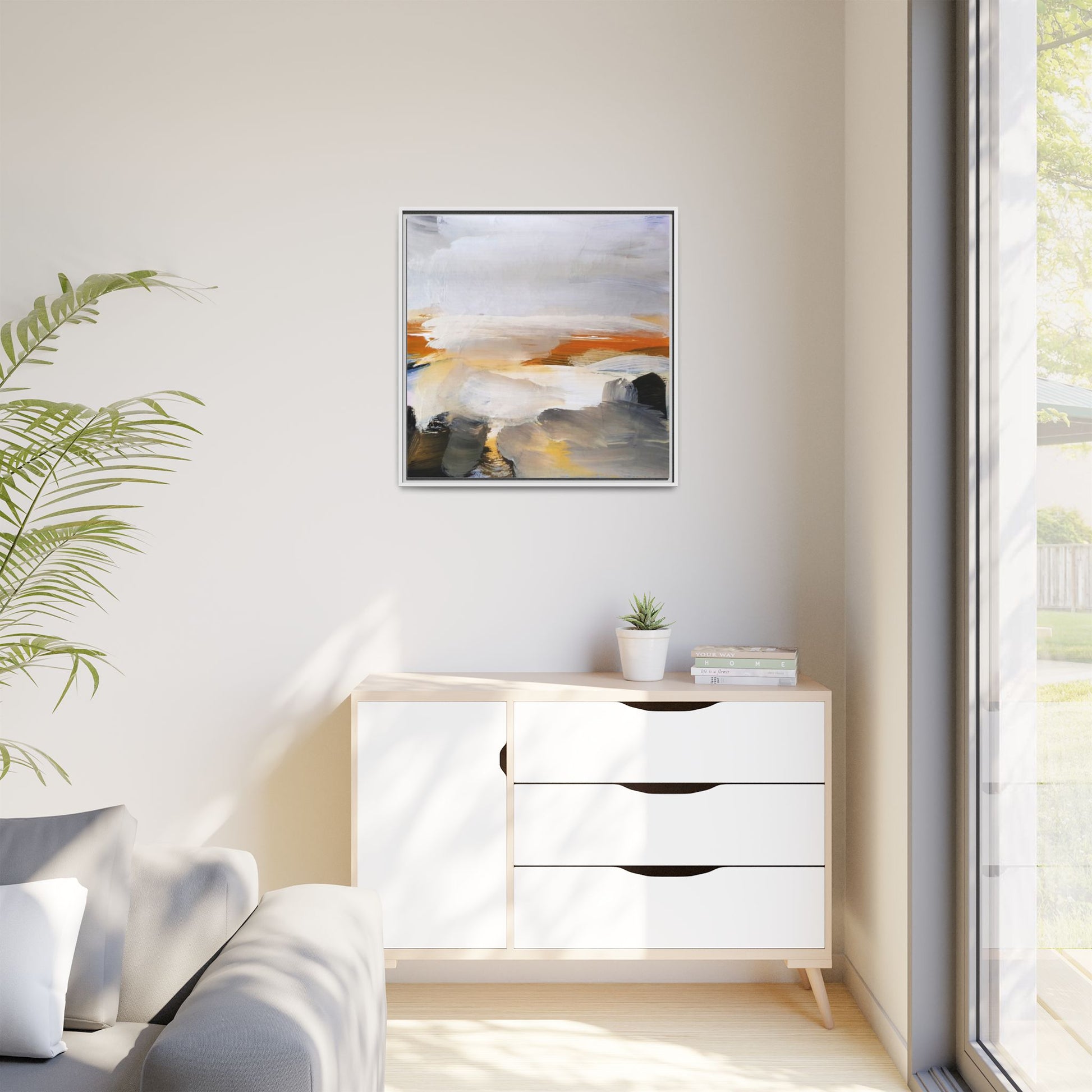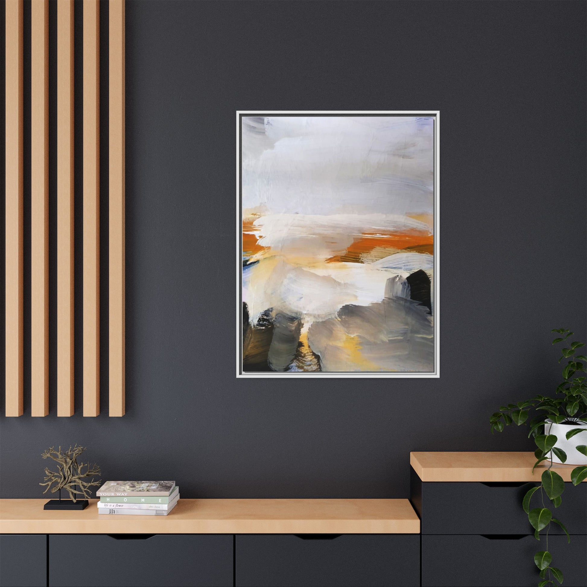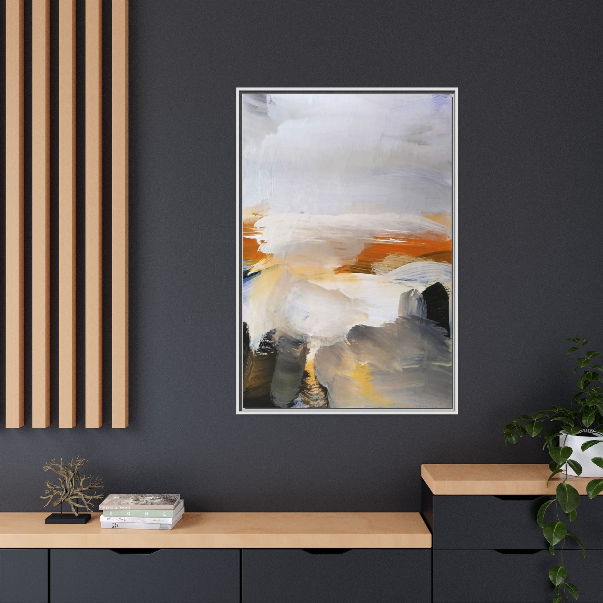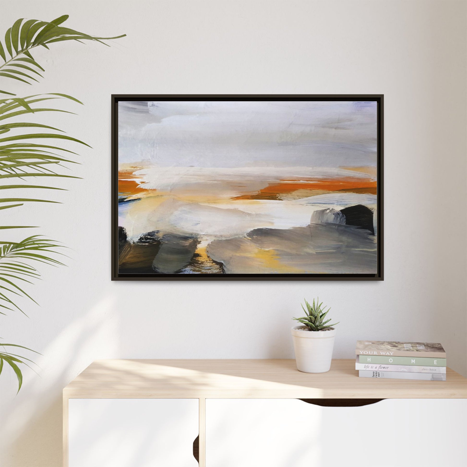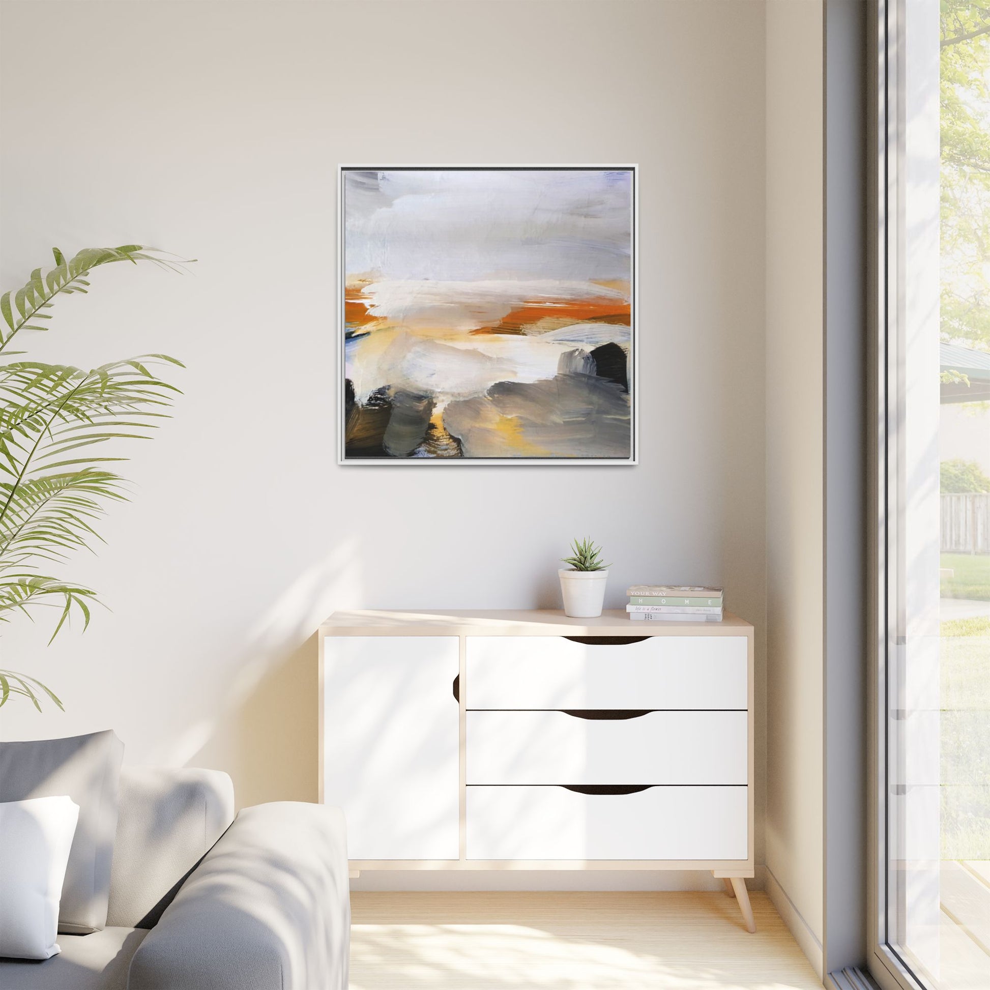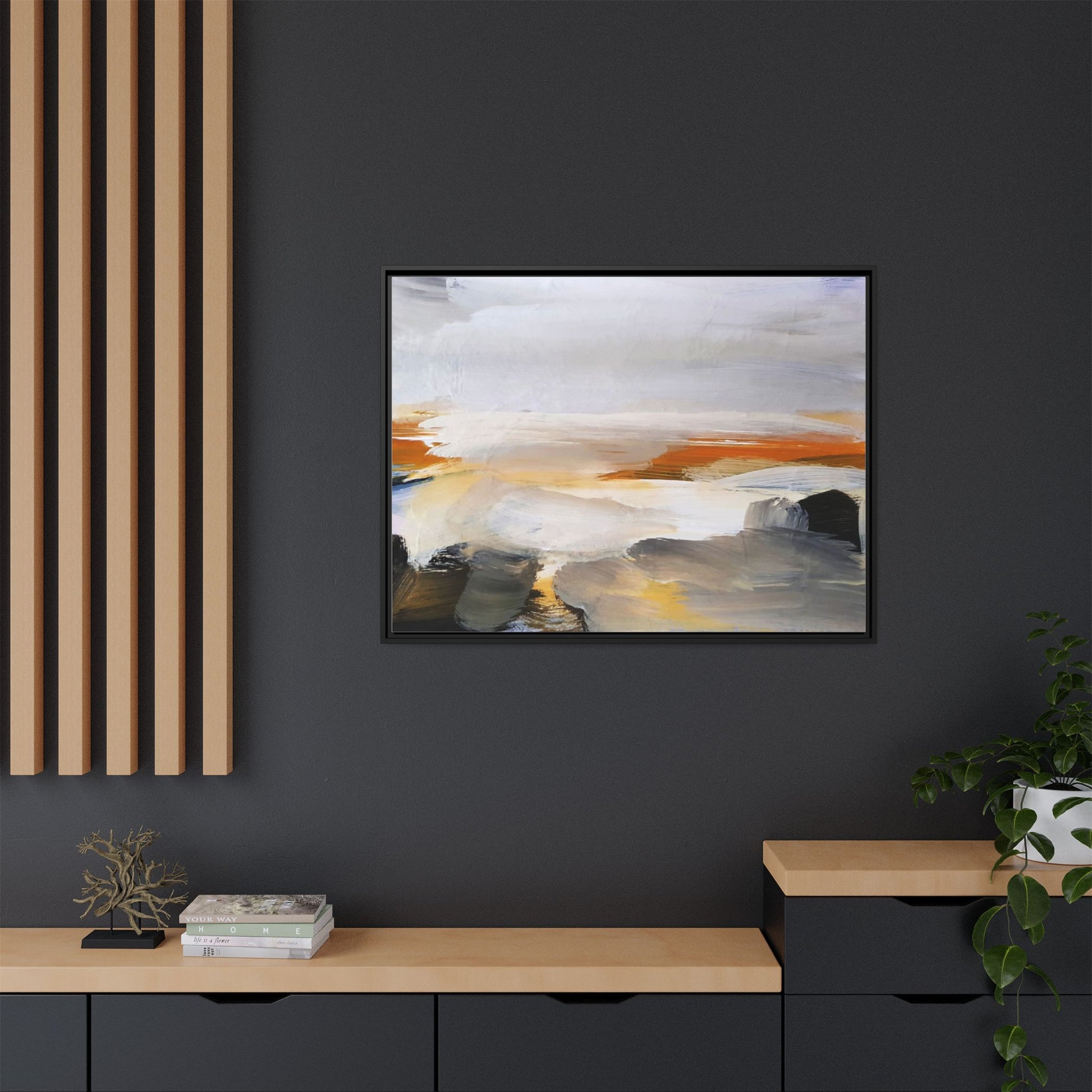 This captivating abstract landscape painting features a dynamic interplay of muted colors and sweeping brushstrokes, creating a sense of expansive depth and movement. The composition is dominated by soft whites, warm oranges, and cool grays that blend seamlessly across the canvas, evoking the atmospheric qualities of a distant horizon or ethereal landscape. Bold, textured brushwork gives the painting a sense of energy and motion, with horizontal streaks suggesting a windswept terrain or a distant seascape. The color palette transitions from bright, golden yellows on the edges to more subdued, silvery whites and grays in the central area, creating a luminous and contemplative mood. The painting's abstract style allows viewers to interpret the scene freely, inviting personal reflection on the interplay of light, space, and natural forms.
