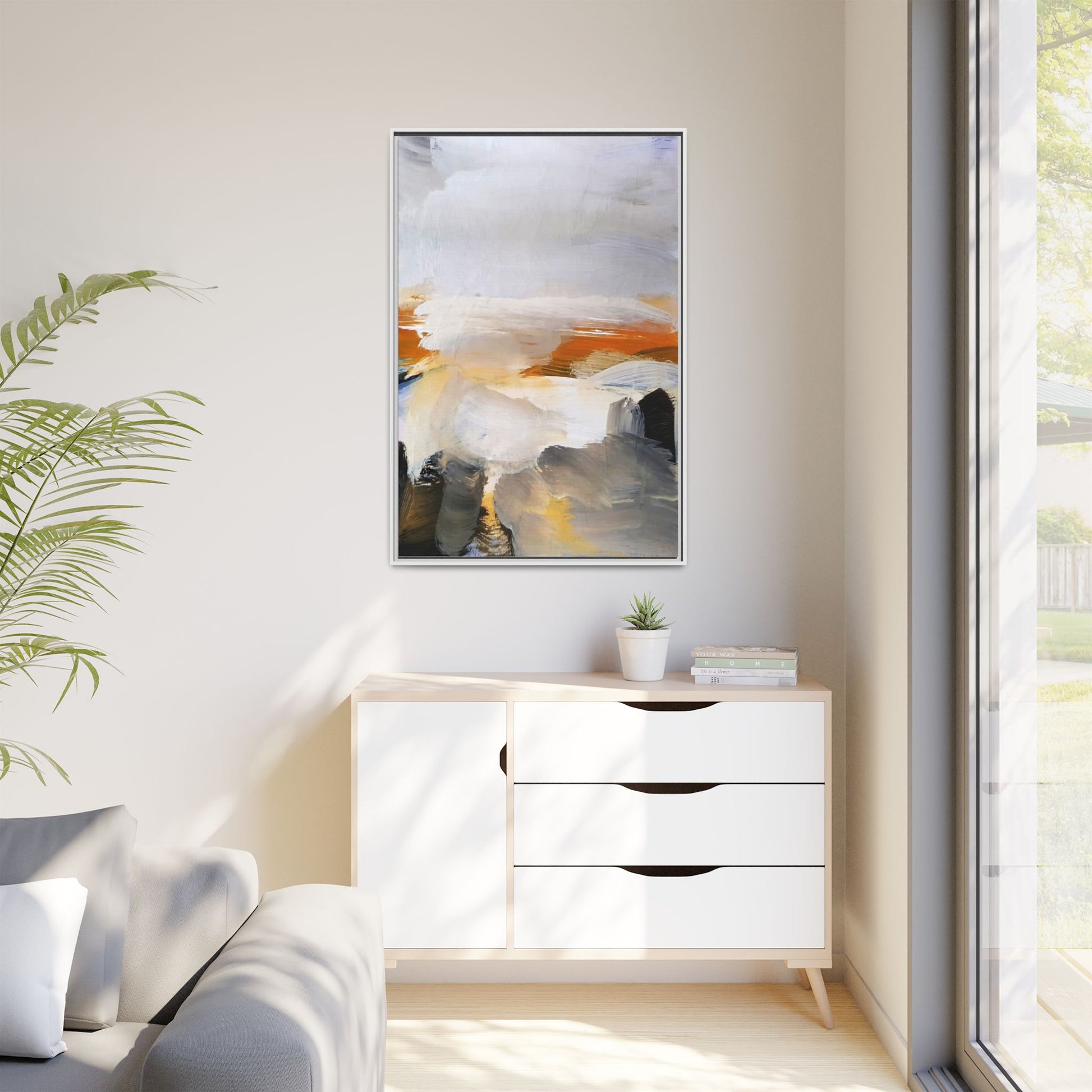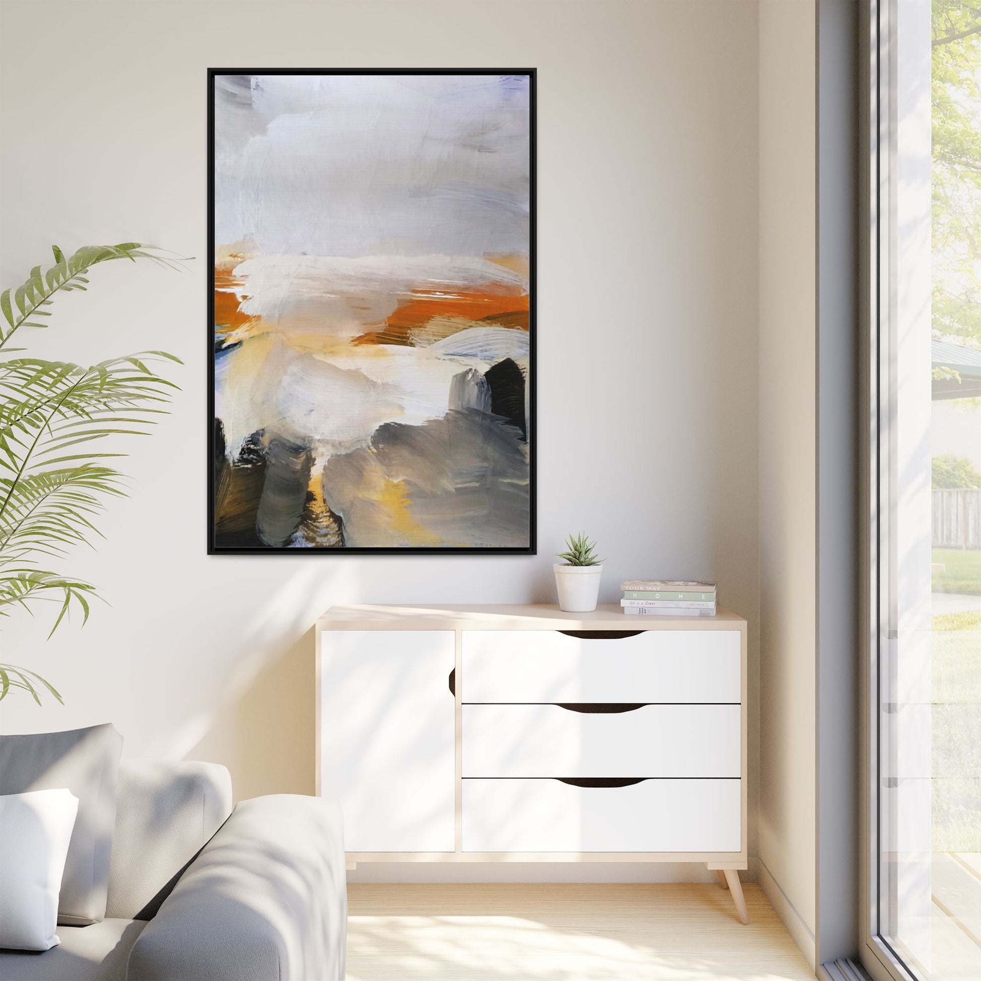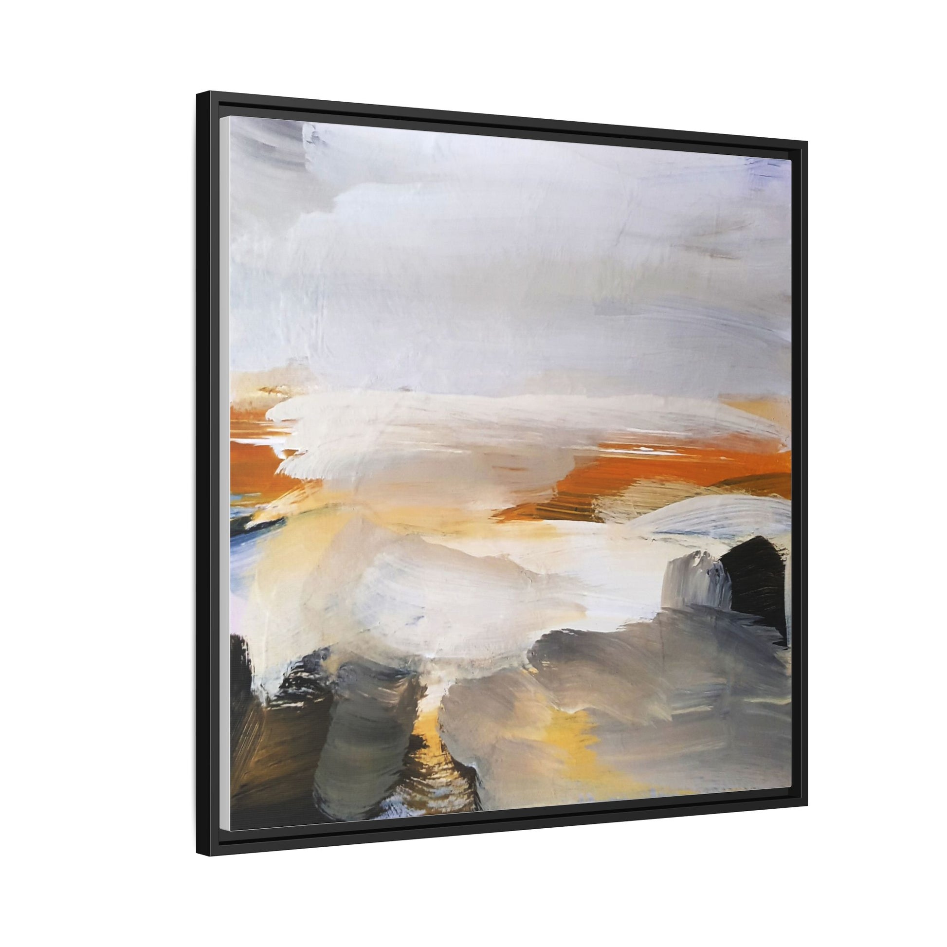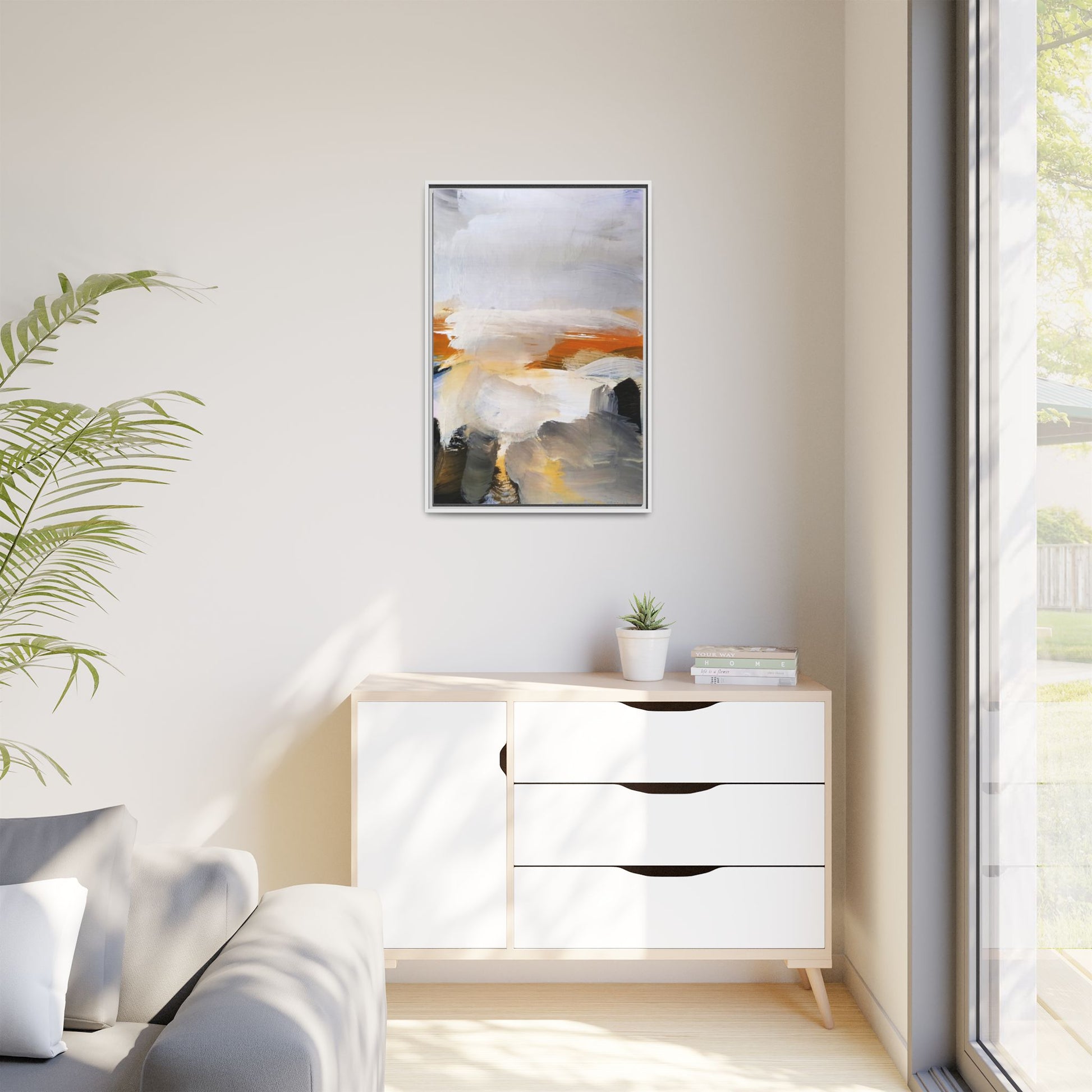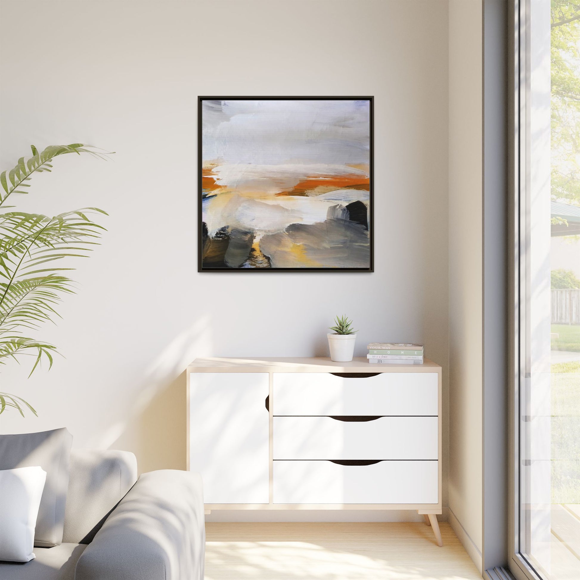 This captivating abstract landscape painting features a dynamic interplay of muted colors and sweeping brushstrokes, creating a sense of expansive depth and movement. The composition is dominated by soft whites, warm oranges, and cool grays that blend seamlessly across the canvas, evoking the atmospheric qualities of a distant horizon or ethereal landscape. Bold, textured brushwork gives the painting a sense of energy and motion, with horizontal streaks suggesting a windswept terrain or a distant seascape. The color palette transitions from bright, golden yellows on the edges to more subdued, silvery whites and grays in the central area, creating a luminous and contemplative mood. The painting's abstract style allows viewers to interpret the scene freely, inviting personal reflection on the interplay of light, space, and natural forms.