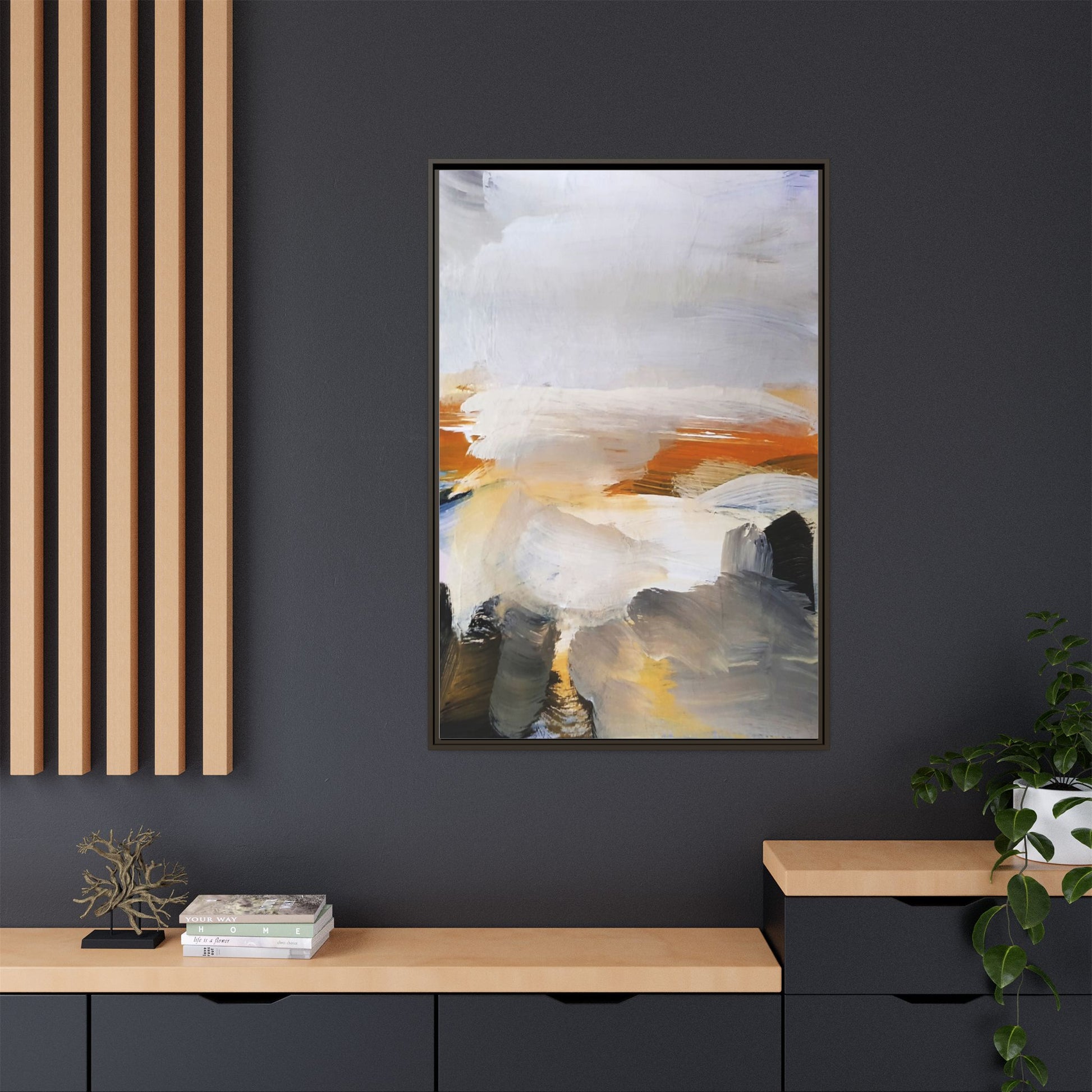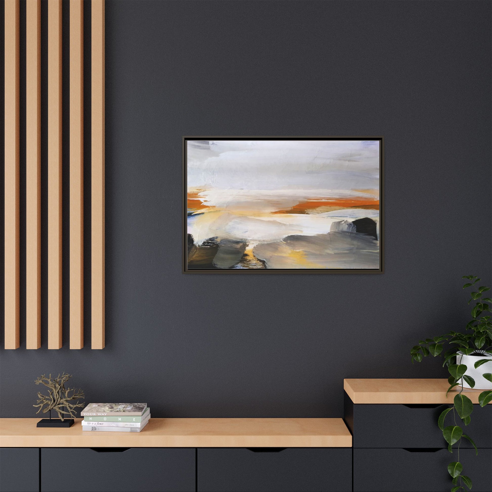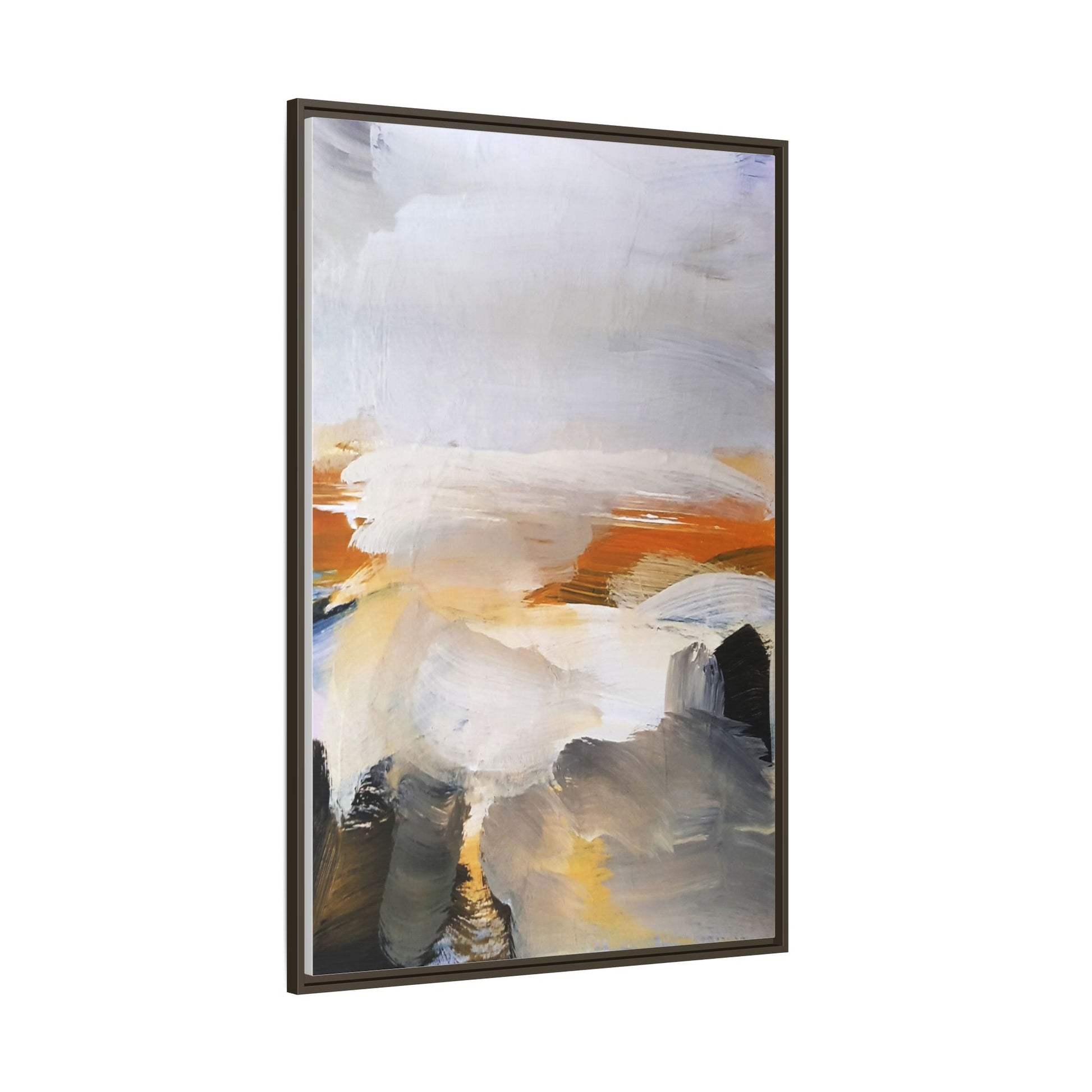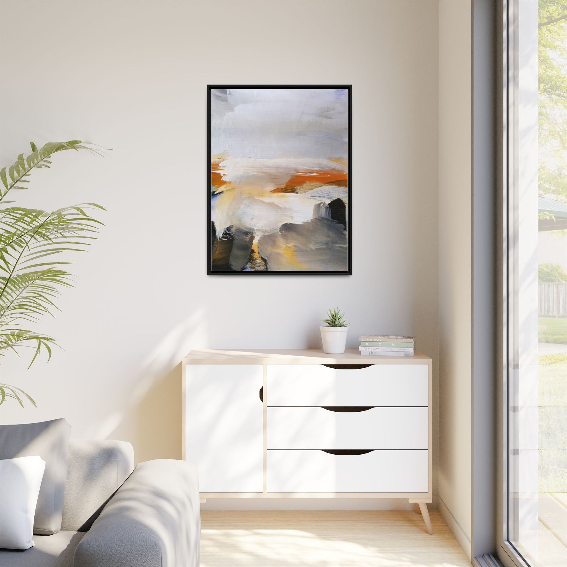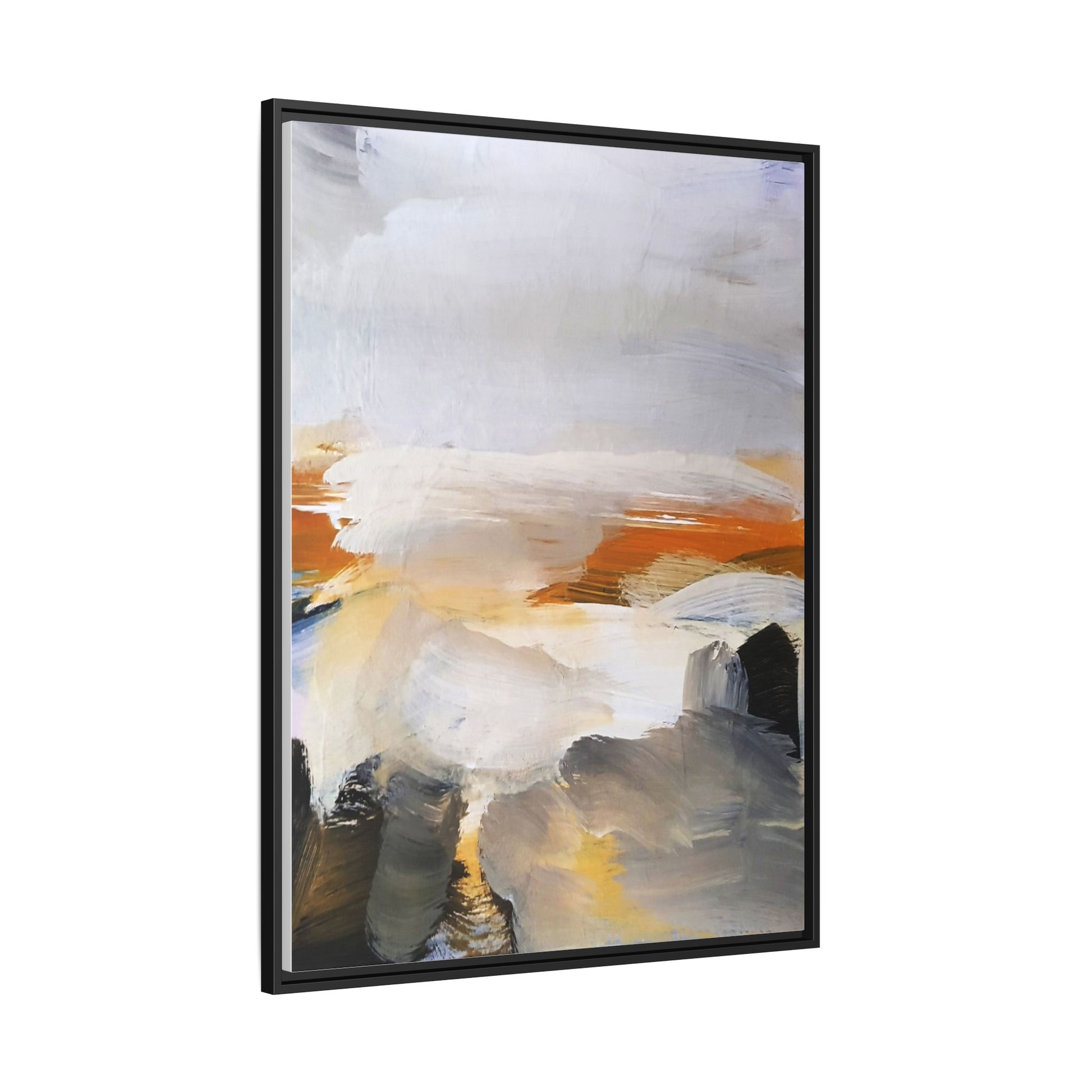 This captivating abstract landscape painting features a dynamic interplay of muted colors and sweeping brushstrokes, creating a sense of expansive depth and movement. The composition is dominated by soft whites, warm oranges, and cool grays that blend seamlessly across the canvas, evoking the atmospheric qualities of a distant horizon or ethereal landscape. Bold, textured brushwork gives the painting a sense of energy and motion, with horizontal streaks suggesting a windswept terrain or a distant seascape. The color palette transitions from bright, golden yellows on the edges to more subdued, silvery whites and grays in the central area, creating a luminous and contemplative mood. The painting's abstract style allows viewers to interpret the scene freely, inviting personal reflection on the interplay of light, space, and natural forms.