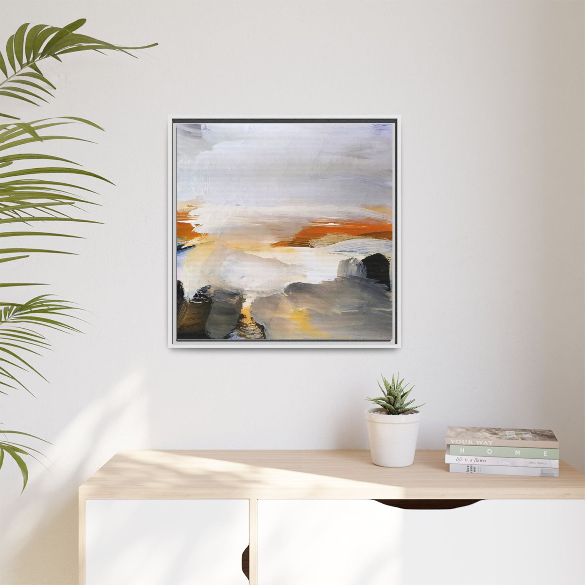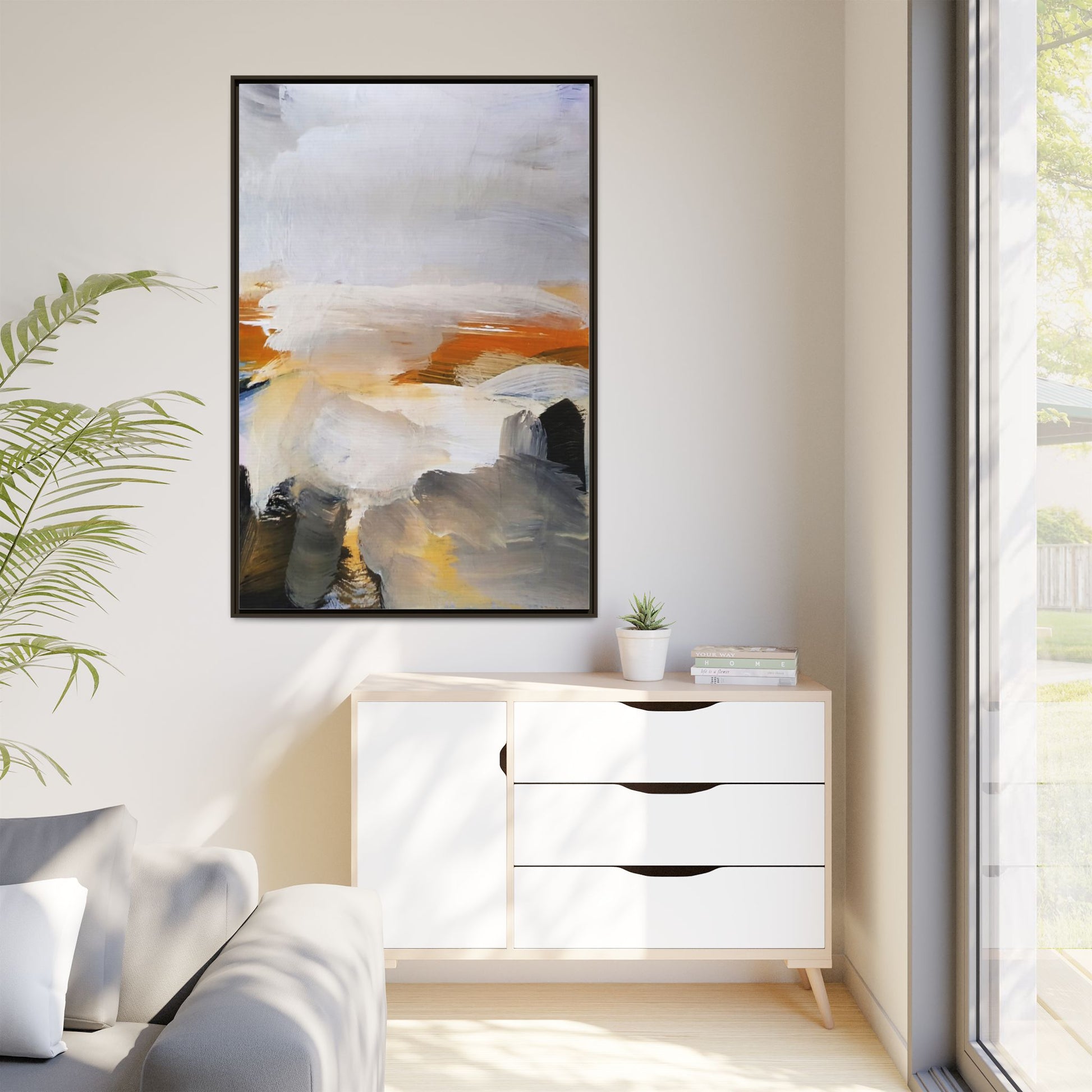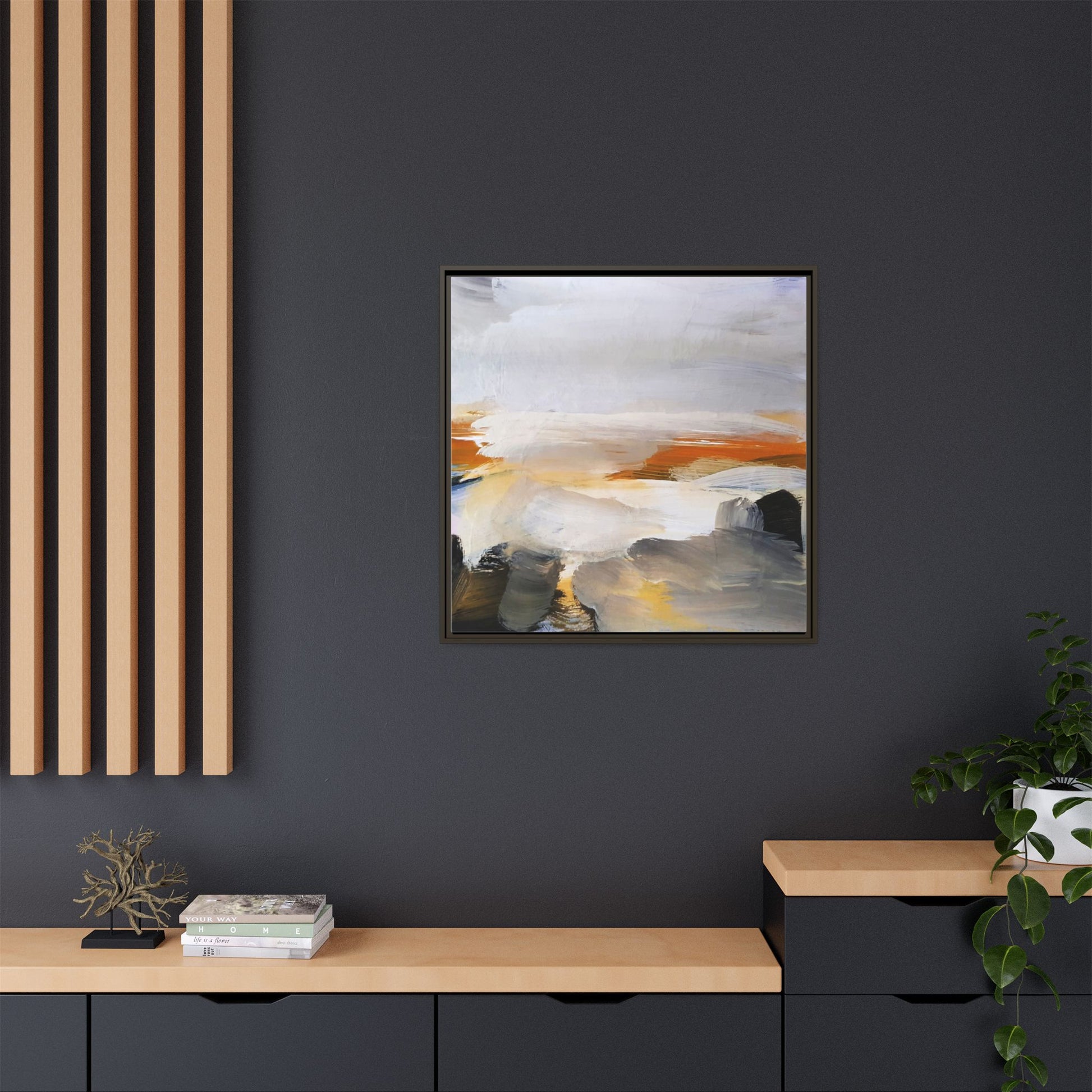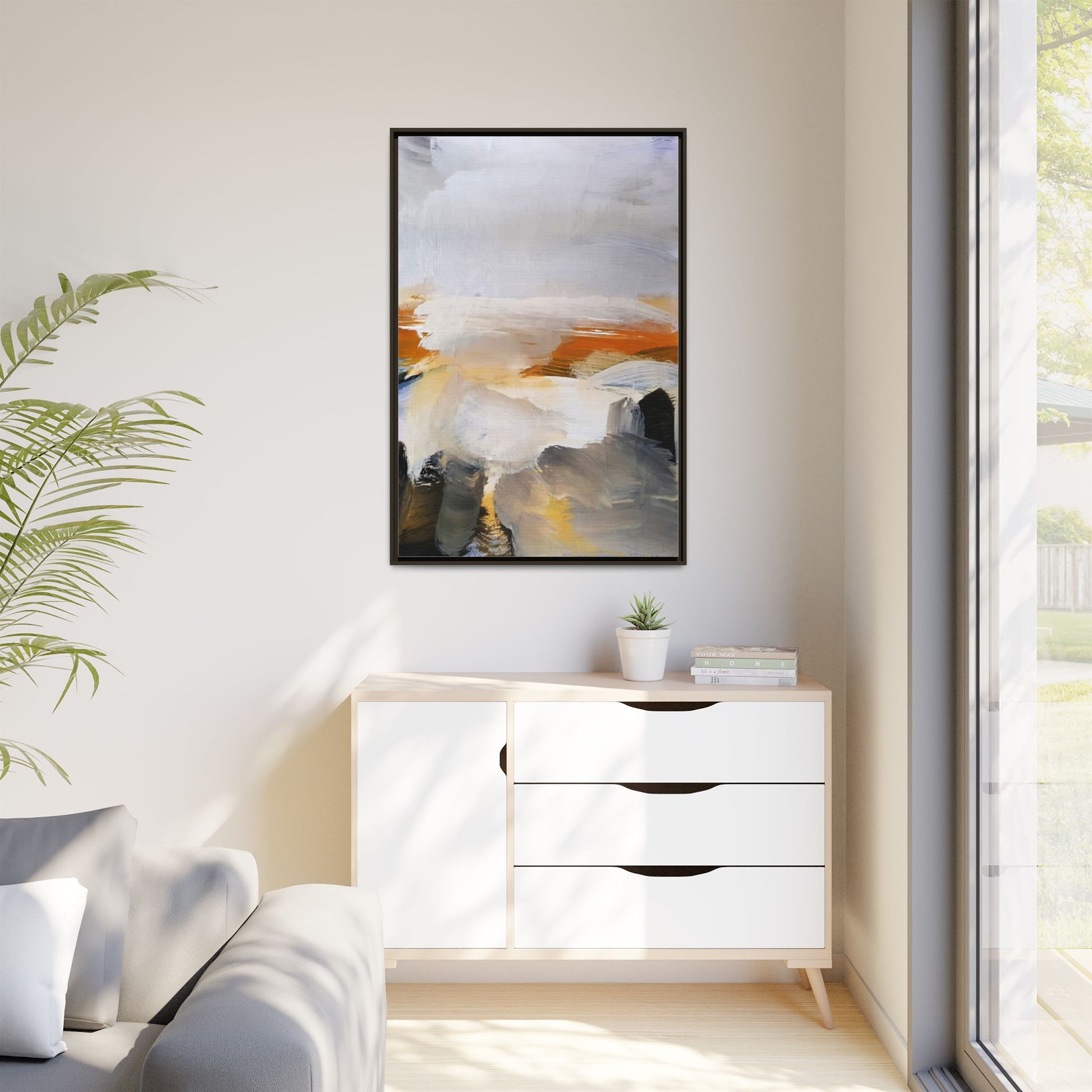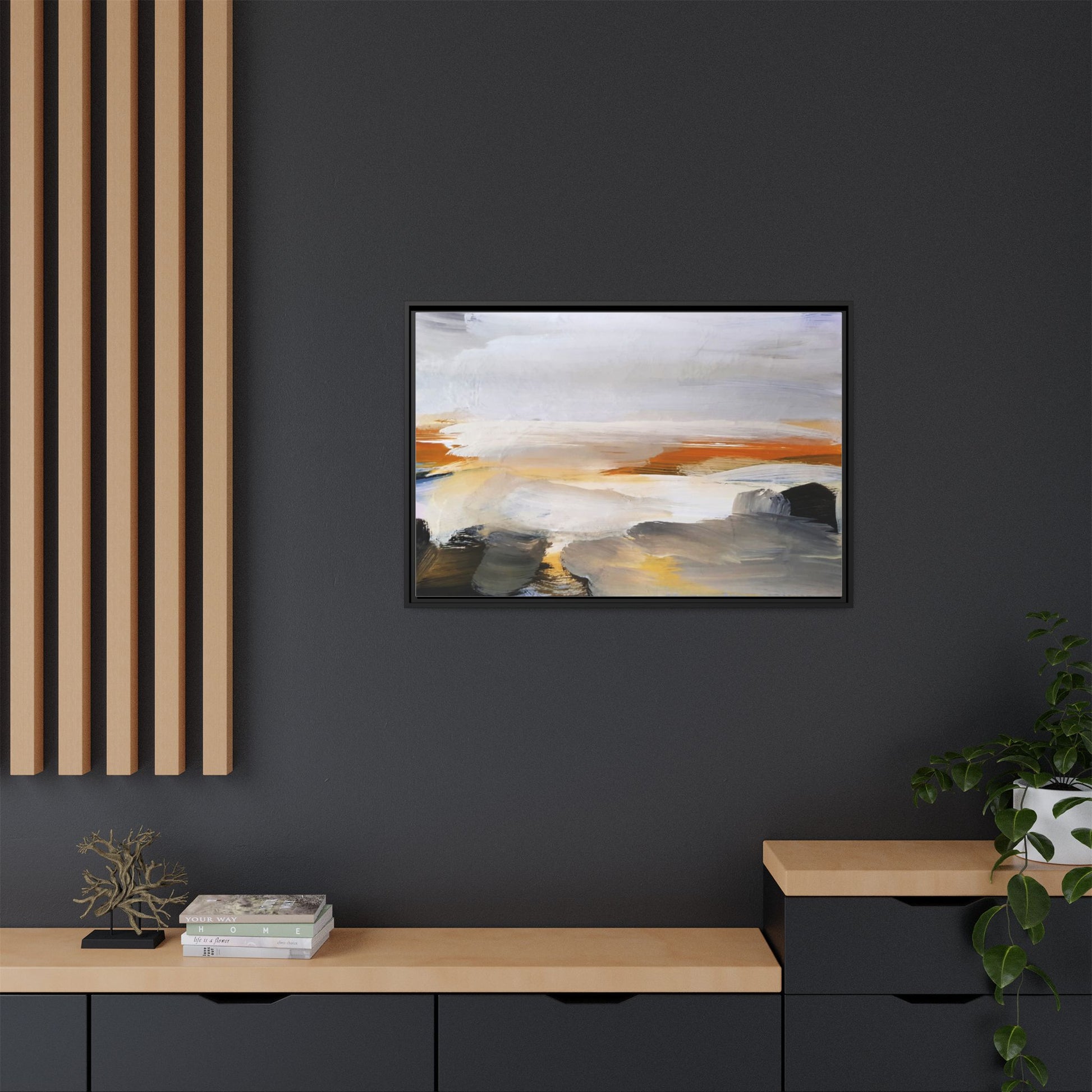 This captivating abstract landscape painting features a dynamic interplay of muted colors and sweeping brushstrokes, creating a sense of expansive depth and movement. The composition is dominated by soft whites, warm oranges, and cool grays that blend seamlessly across the canvas, evoking the atmospheric qualities of a distant horizon or ethereal landscape. Bold, textured brushwork gives the painting a sense of energy and motion, with horizontal streaks suggesting a windswept terrain or a distant seascape. The color palette transitions from bright, golden yellows on the edges to more subdued, silvery whites and grays in the central area, creating a luminous and contemplative mood. The painting's abstract style allows viewers to interpret the scene freely, inviting personal reflection on the interplay of light, space, and natural forms.