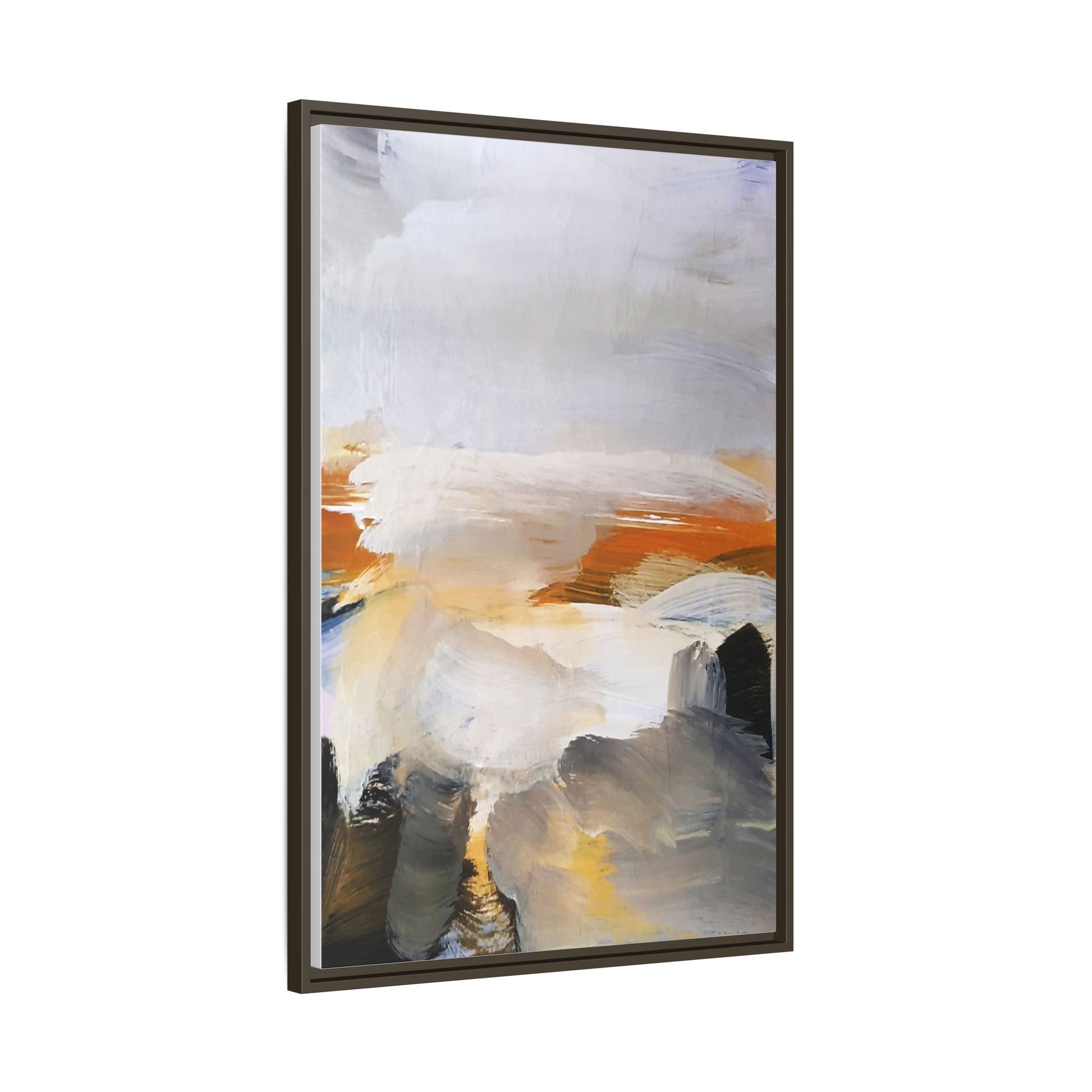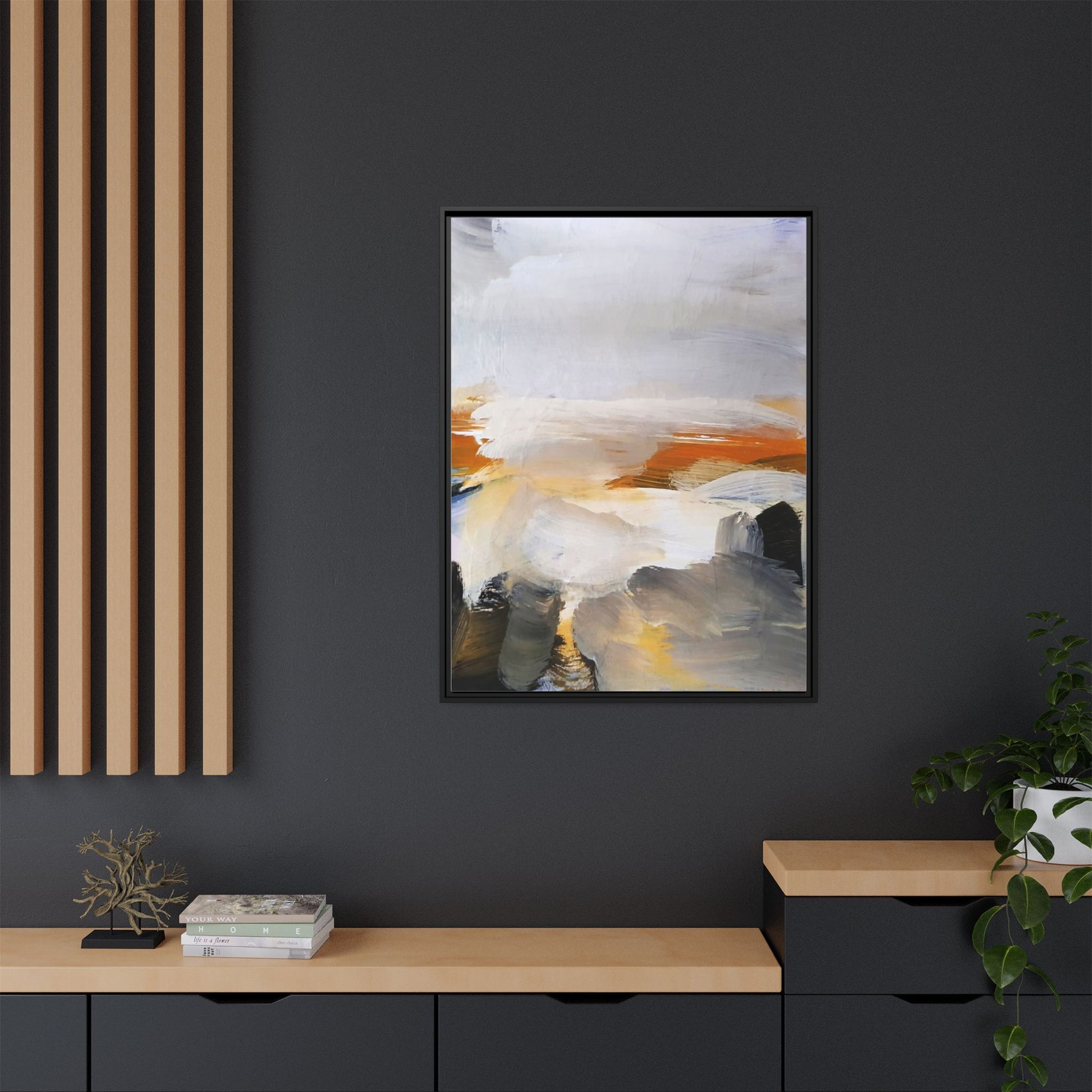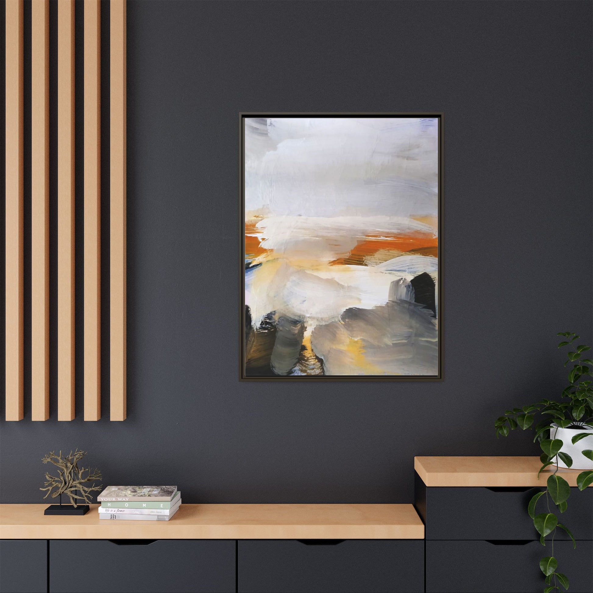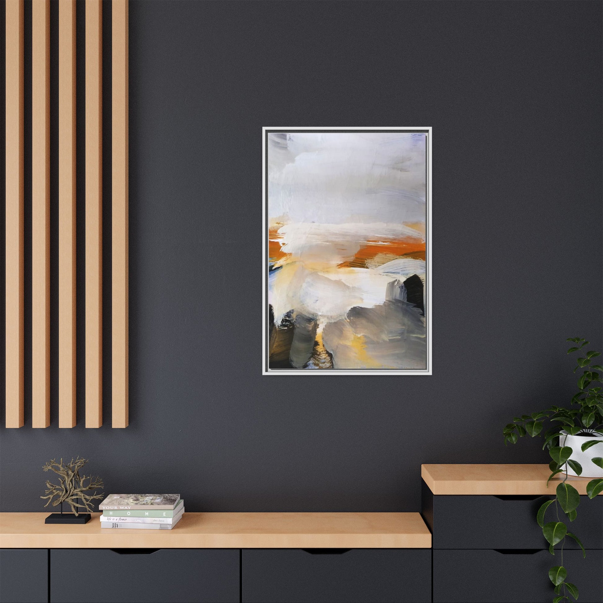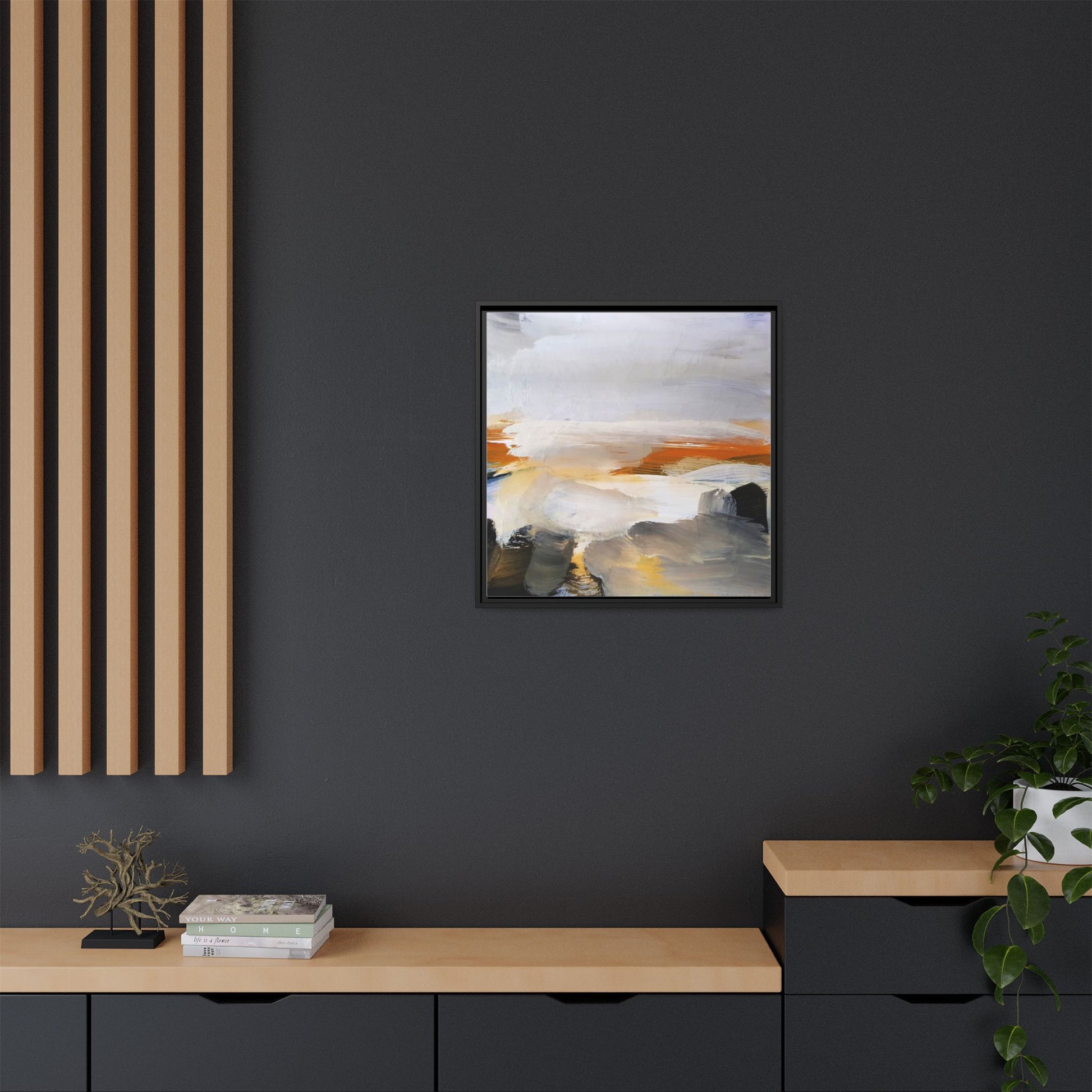 This captivating abstract landscape painting features a dynamic interplay of muted colors and sweeping brushstrokes, creating a sense of expansive depth and movement. The composition is dominated by soft whites, warm oranges, and cool grays that blend seamlessly across the canvas, evoking the atmospheric qualities of a distant horizon or ethereal landscape. Bold, textured brushwork gives the painting a sense of energy and motion, with horizontal streaks suggesting a windswept terrain or a distant seascape. The color palette transitions from bright, golden yellows on the edges to more subdued, silvery whites and grays in the central area, creating a luminous and contemplative mood. The painting's abstract style allows viewers to interpret the scene freely, inviting personal reflection on the interplay of light, space, and natural forms.
