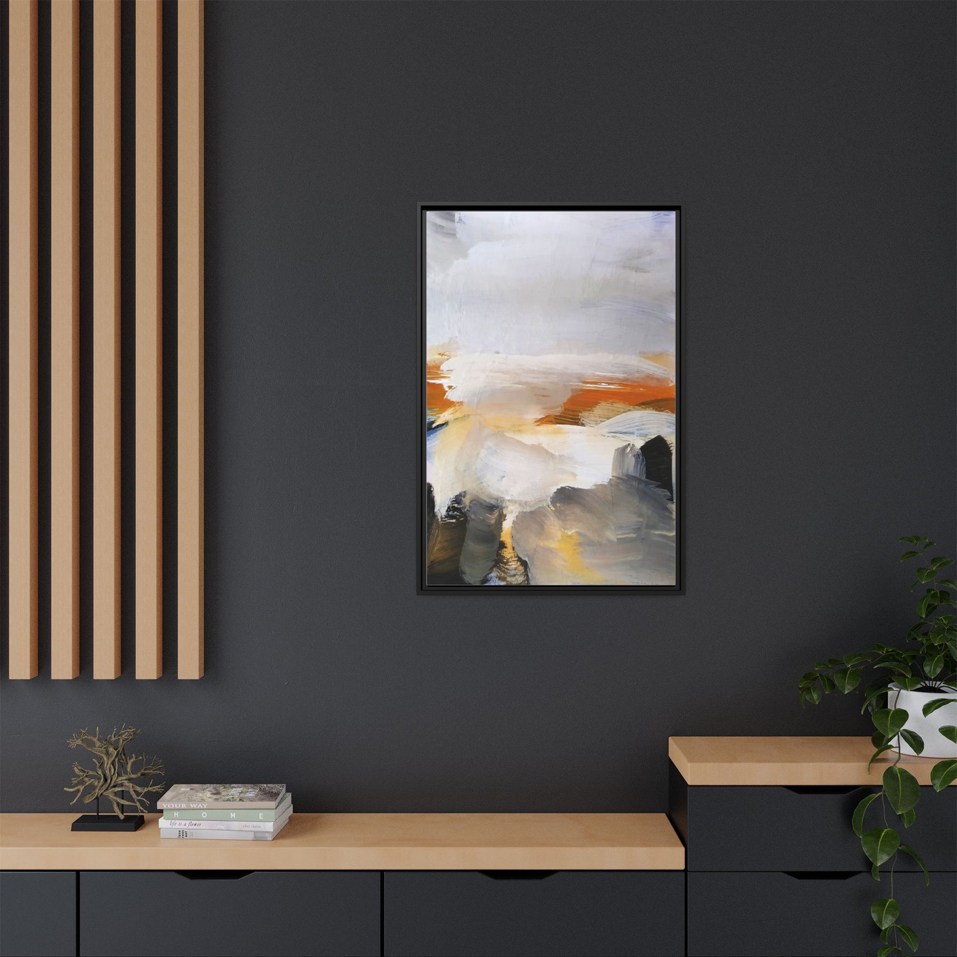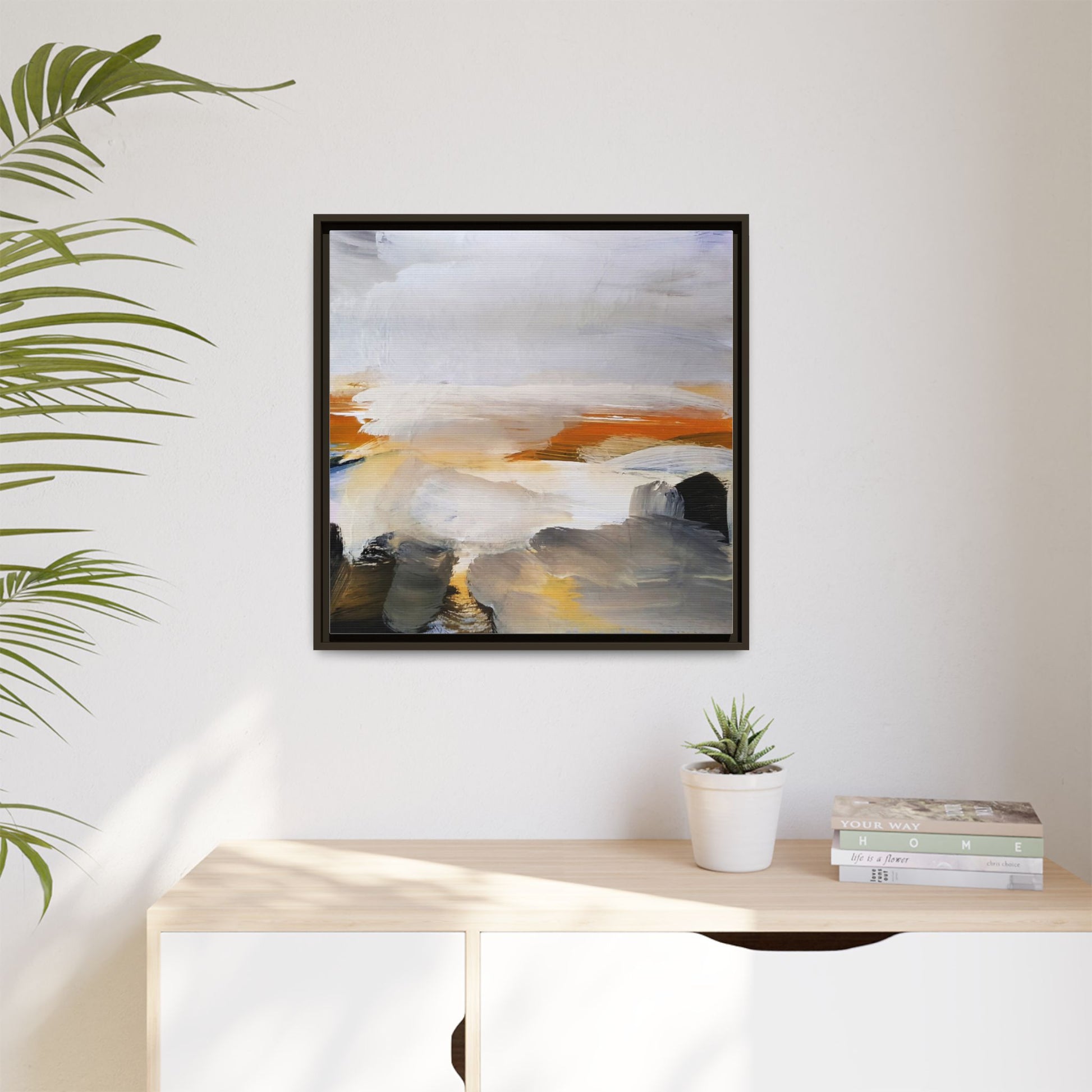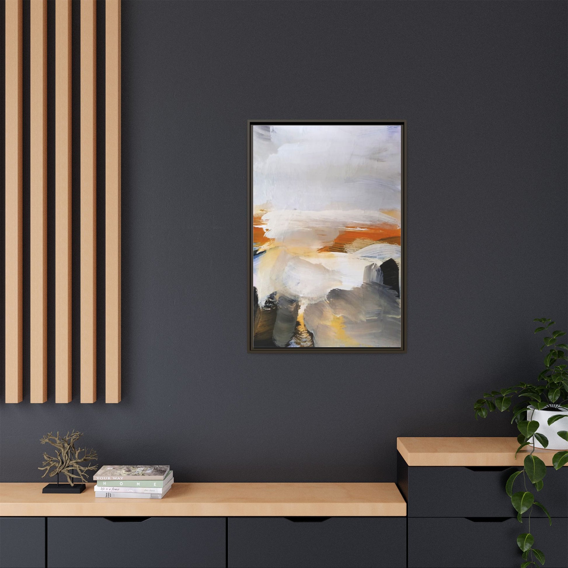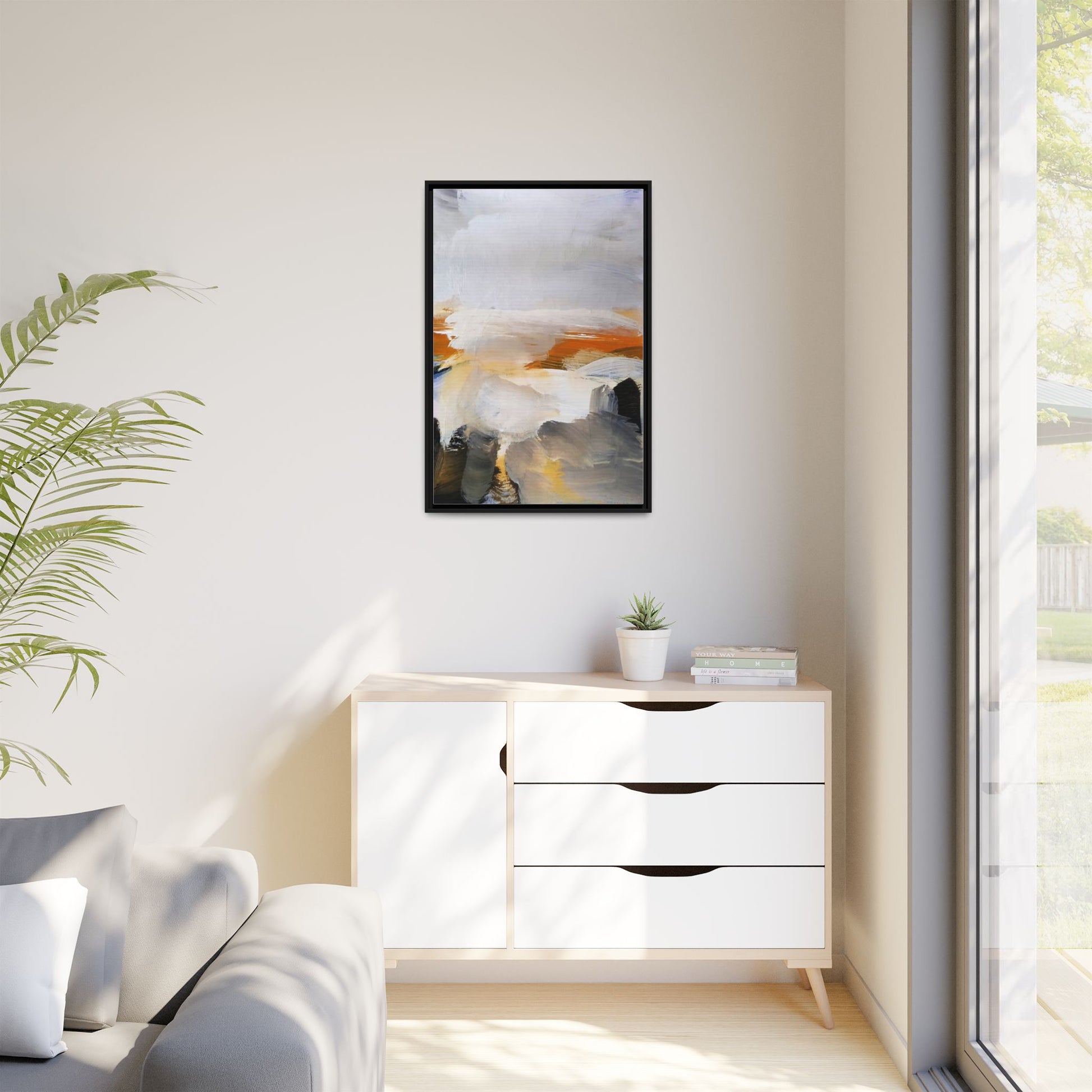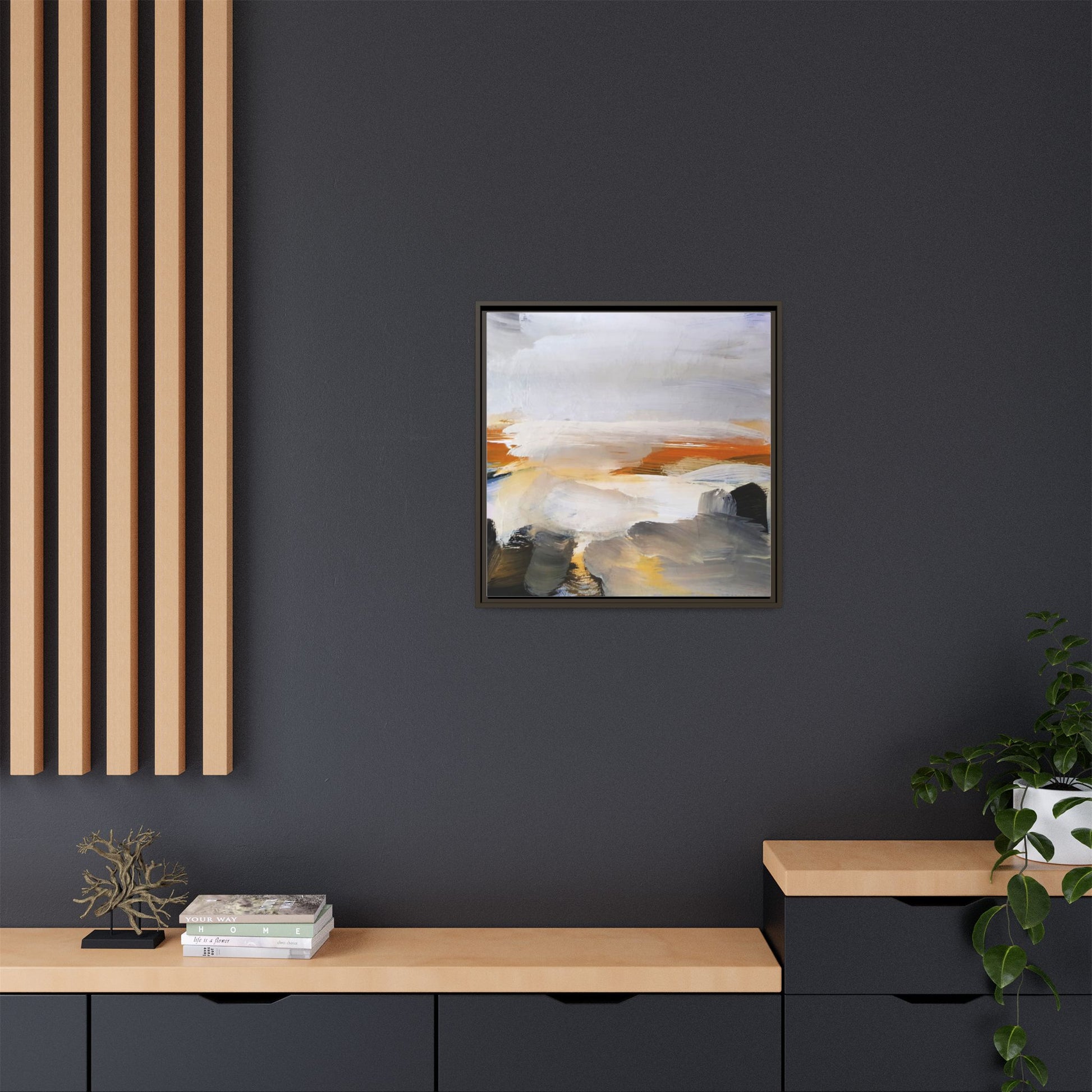 This captivating abstract landscape painting features a dynamic interplay of muted colors and sweeping brushstrokes, creating a sense of expansive depth and movement. The composition is dominated by soft whites, warm oranges, and cool grays that blend seamlessly across the canvas, evoking the atmospheric qualities of a distant horizon or ethereal landscape. Bold, textured brushwork gives the painting a sense of energy and motion, with horizontal streaks suggesting a windswept terrain or a distant seascape. The color palette transitions from bright, golden yellows on the edges to more subdued, silvery whites and grays in the central area, creating a luminous and contemplative mood. The painting's abstract style allows viewers to interpret the scene freely, inviting personal reflection on the interplay of light, space, and natural forms.